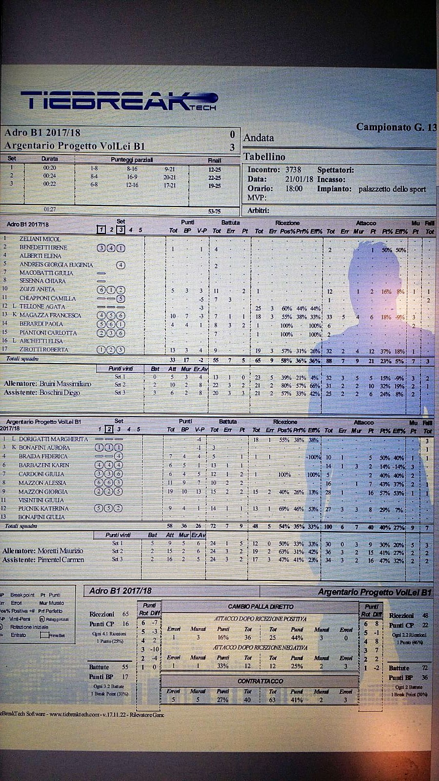 Nel tabellino finale si può notare quanto le trentine siano state superiori in tutti i fondamentali. In battuta (9 punti contro 5), in attacco (40% contro 23%) e a muro (9 punti contro 7). Da sottolineare è la prestazione di Giorgia Mazzon, autrice di 19 punti.