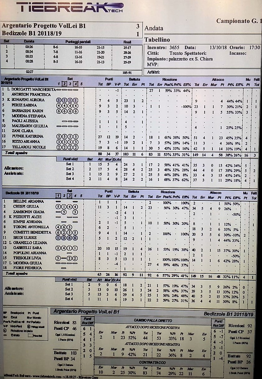 Il tabellino finale dimostra quanto la partita sia stata combattuta a dispetto del punteggio finale. Bedizzole, superiore in battuta (11 punti contro 6) e in difesa (57% contro 53%), è stata inferiore in attacco (32% contro 38%) e a muro (4 punti contro 16).