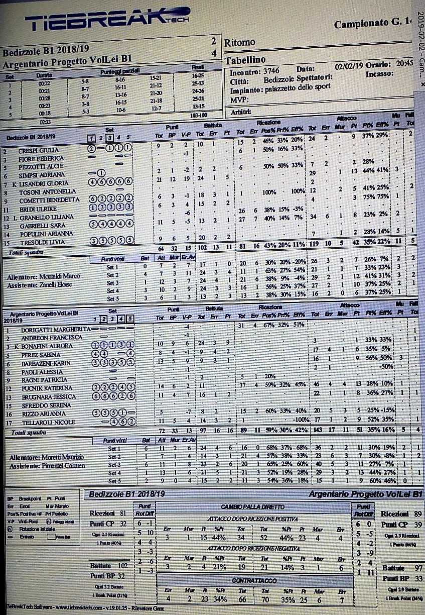 Al tie-break le padrone di casa partono bene (5-3). Poco dopo la metà il tabellone dice più quarto Bedizzole (10-6). Il finale è momento più bello della partita perché, sotto di cinque (12-7), l’Argentario ribalta in maniera sorprendente il punteggio e chiude set e partita sul punteggio di 13-15.
