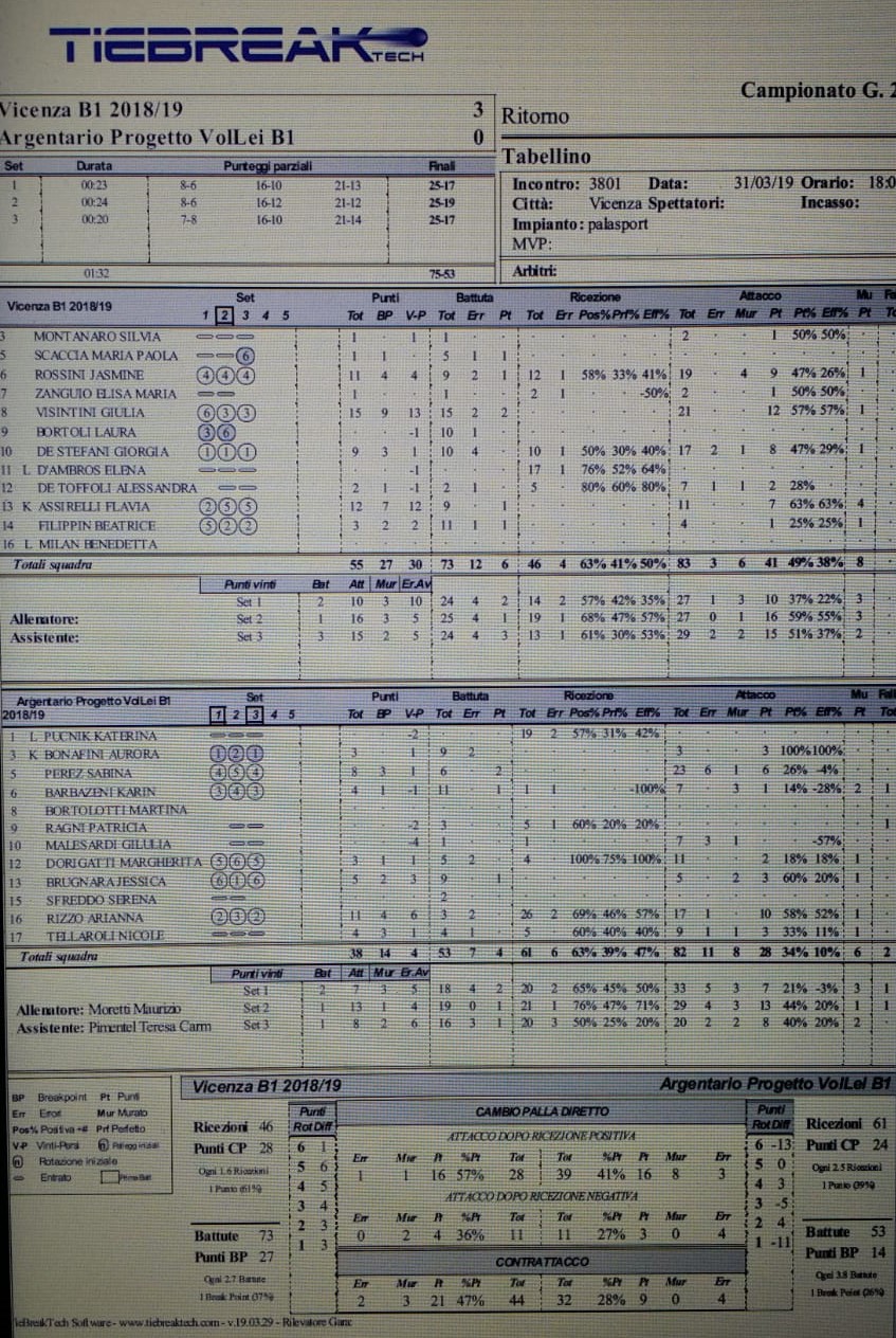 I dati del tabellino finale evidenziano la superiorità espressa in campo dalle venete: battuta (6 punti contro 4), ricezione (63% contro 63%), attacco (49% contro 34%), muro (8 punti contro 6). Top scorer di giornata l’ex Giulia Visintini (15 punti). Per Vicenza in doppia cifra anche capitan Flavia Assirelli (12 punti) e Jasmine Rossini (11 punti). In casa Argentario Arianna Rizzo unica giocatrice oltre i dieci punti (11).