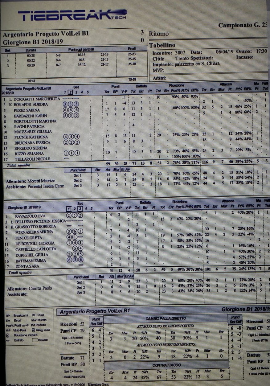 L’andamento della terza frazione è nuovamente più equilibrato, ma le trentine partono decise (8-7). Sotto i colpi di Pucnik e Perez, Giorgione fatica a tenere il passo delle padrone di casa, che piazzano il break definitivo per portarsi a casa il match (16-12). Con il vantaggio acquisito l’Argentario gestisce il match e vince meritatamente set e partita con il punteggio di 25-20.