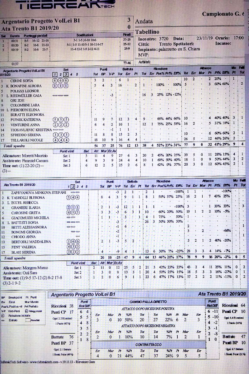 L’Argentario VolLei parte con Bonafini in regia, Tellaroli opposta, Cerini e Sfreddo al centro, Pucnik e Venturini in banda e con il debutto di Riedmüller come libero in sostituzione di Pierobon, bloccata da problemi alla schiena. L'Ata Walliance risponde con una formazione prettamente giovanile: Granieri in regia, Tasholli opposta, Blasi e Carosini in banda, Bertolotti e Fent al centro, Battisti libero.